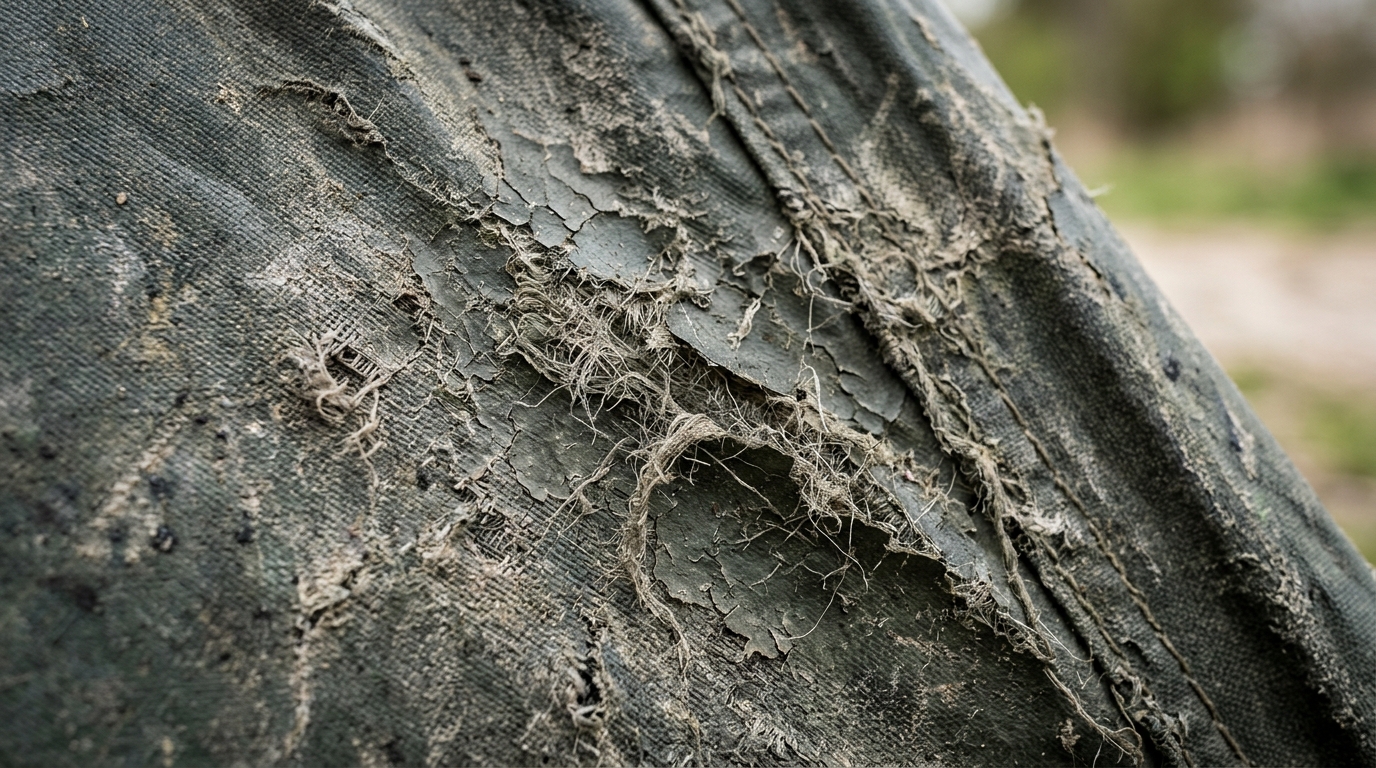 加水分解とは、テント生地の防水コーティングに使われているPU(ポリウレタン)が、空気中の水分と化学反応を起こして分解される現象です。日本の高温多湿な夏の気候は、この加水分解が特に進行しやすい環境です。加水分解が進むと生地がベタつき、防水性が失われ、独特の異臭が発生します。