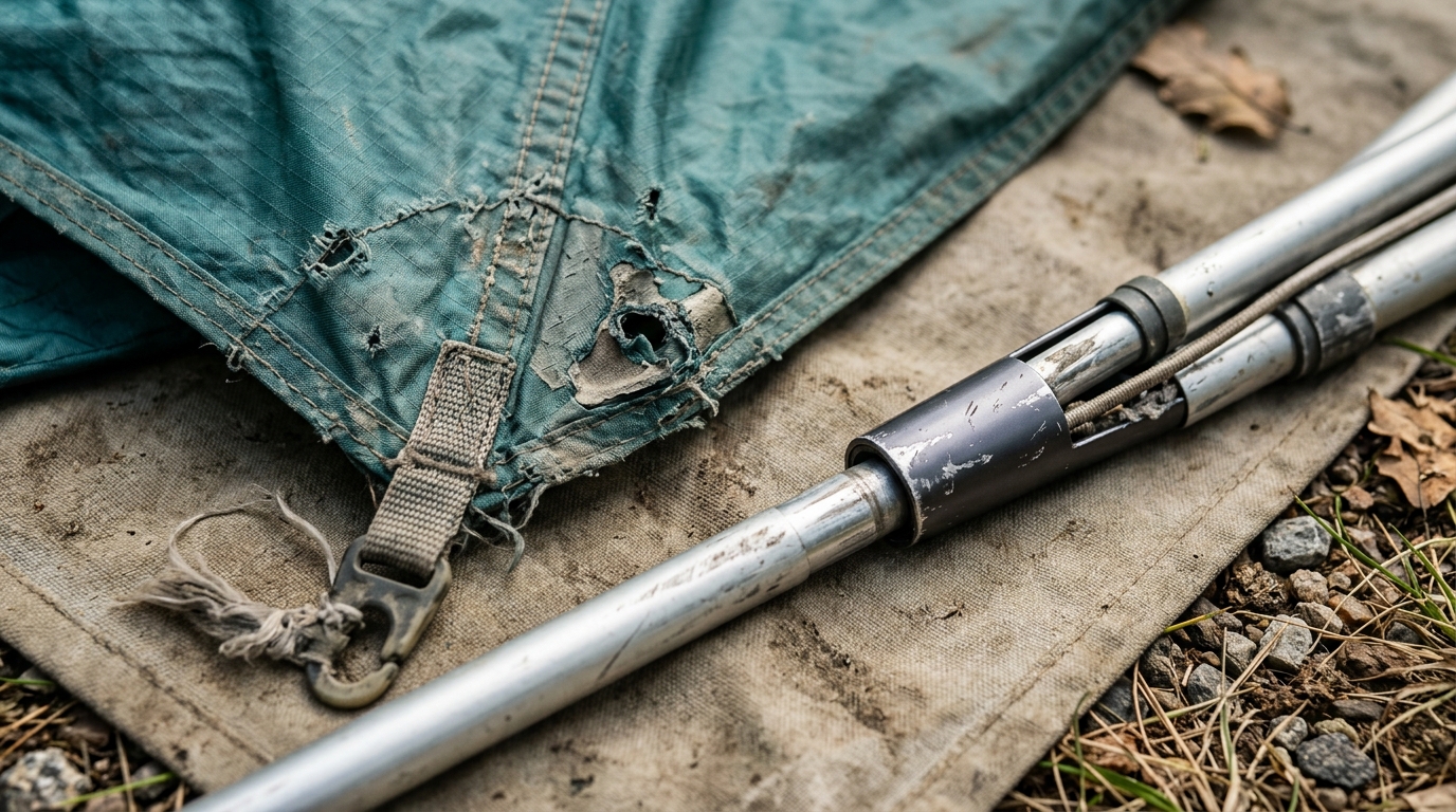 テントの寿命を判断するには、フライシートだけでなくポール(フレーム)の状態も確認することが大切です。テントはフライシート・インナーテント・ポール・ペグなど複数のパーツで構成されており、それぞれ寿命が異なります。